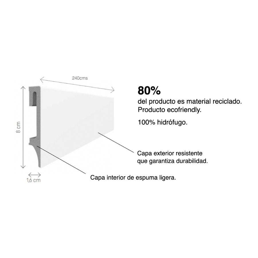 El material del que está fabricado no permite que el rodapié absorba agua, lo que evita que se deforme. Además, consta de una capa exterior resistente que garantiza durabilidad y de una capa interior de espuma ligera.